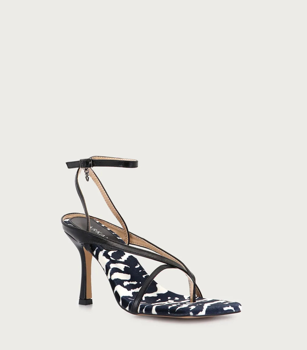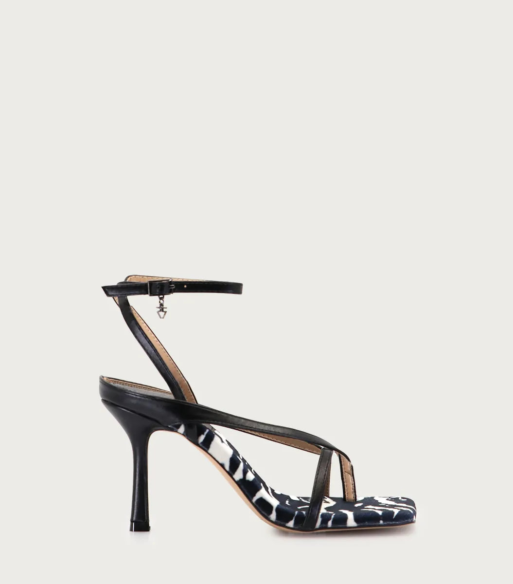 Sandalia Rumeri cebra en fibras animal friendly, con detalle de hebilla con logo y forrería a tono. Taco y plantilla forrados en el mismo material de la capellada, altura del taco: 8 cm. Diseñada para quienes buscan estilo, comodidad y compromiso con materiales sostenibles. Modelo de horma grande: sugerimos evaluar un talle menos